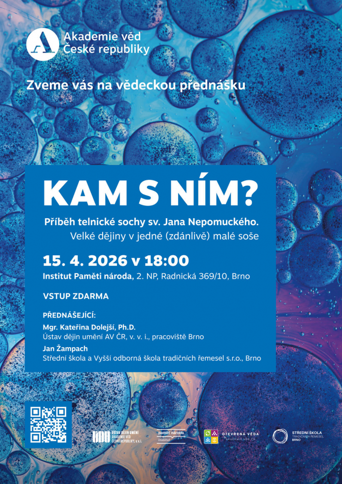 Přednáška vychází z dlouhodobého topografického výzkumu brněnského oddělení uměleckohistorické topografie ÚDU AV ČR a ze středoškolské stáže v programu Otevřená věda AV ČR. Formou dialogu mezi lektorkou a stážistou ukážeme, co všechno dokáže odhalit pečlivé mapování v terénu, lokální prameny, staré mapy a archivní průzkum — a proč má smysl dívat se pozorně i na díla, která často míjíme. Spolupřednášející Jan Žampach s tímto tématem získal 3. místo na celostátní studentské vědecké konferenci. Od začínajícího badatele si poslechnete nečekaně napínavý příběh jedné památky. Přijďte s námi znovu otevřít otázku „Kam s ním?“ – a možná zjistit i „Proč právě tam?“.